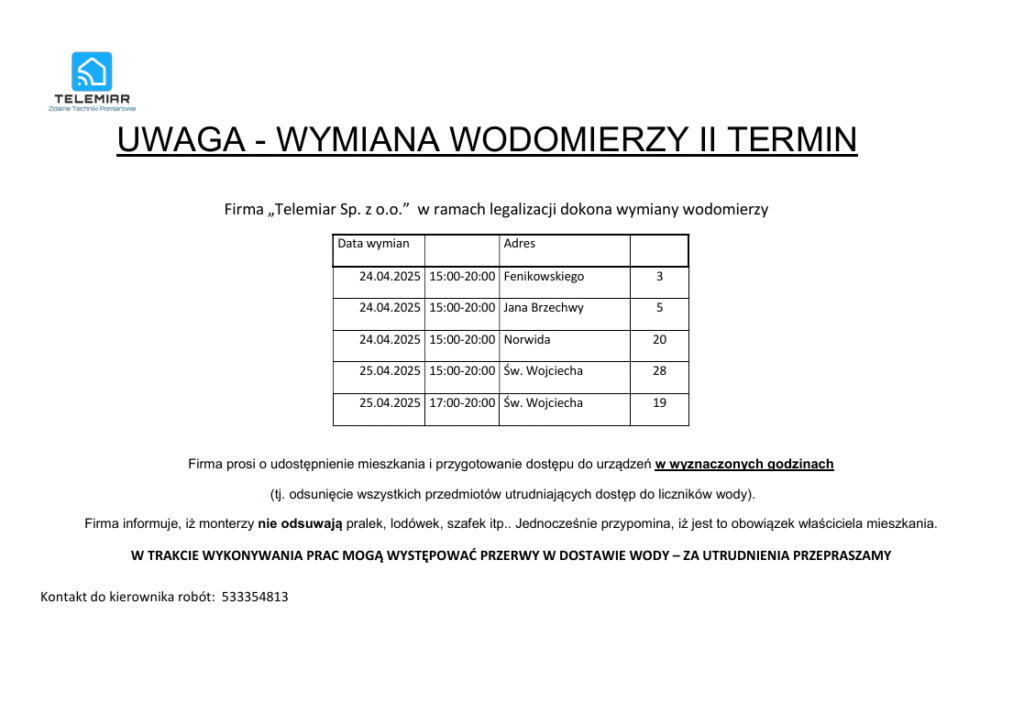 Uwaga- II termin wymiany wodomierzy
